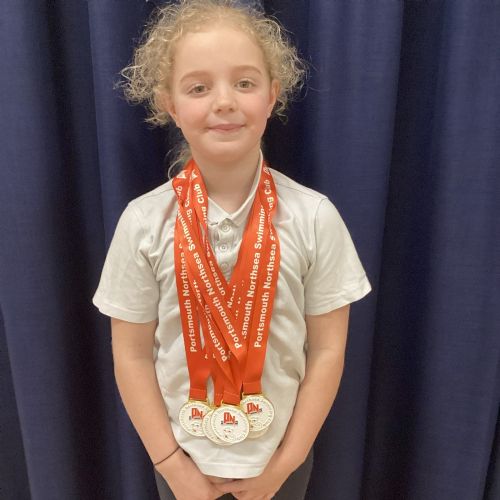 Girls with gold medals for individual swimming races and a bronze medal for her relay race.